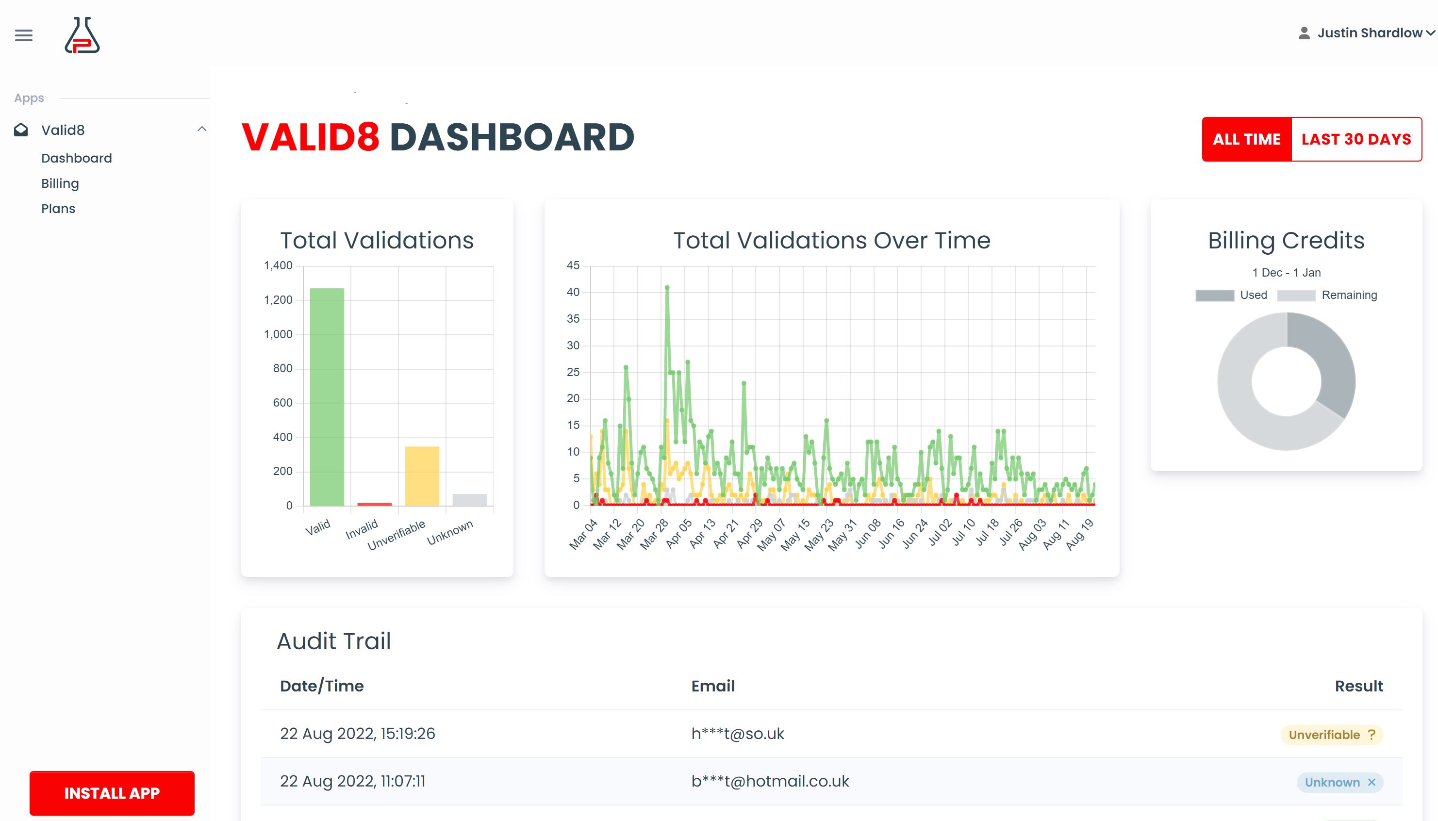 Valid8 includes a real-time dashboard so you can monitor contact email address health in real-time inside your Address Health portal.