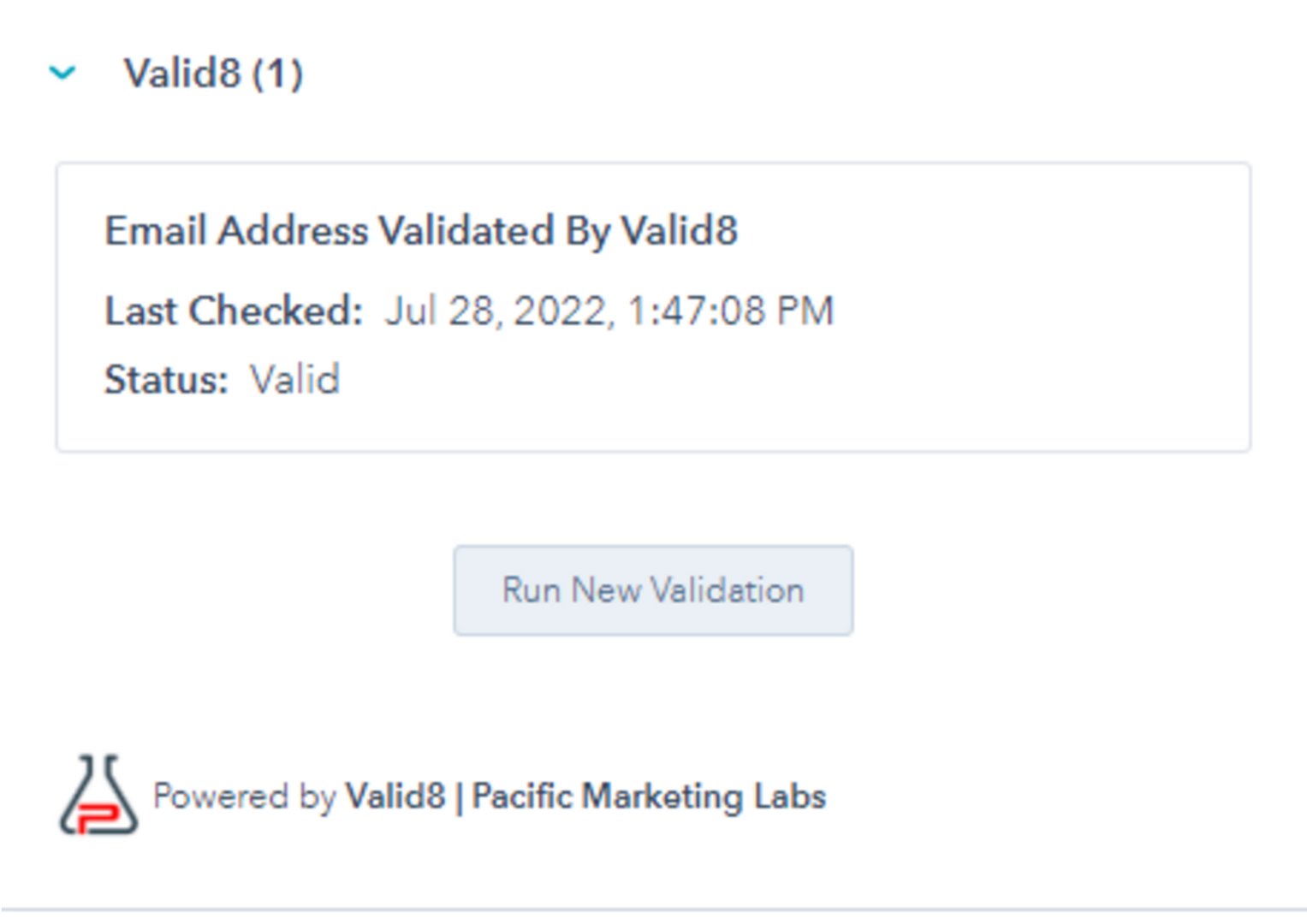 The Valid8 card sits right alongside the contact record, just hit 'Run new validation' to get an instant verification of your contact's email address.